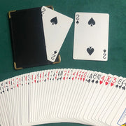You show a business card holder with an odd backed prediction card in (and it remains visible as the card, when tucked into the pocket, leaves an edge protruding). The deck you have been using for your show (a regular pack) is freely shuffled by the spectator, who slides out any card, which is tucked into the opposite side of the wallet. The prediction is removed, and seen to be (for example) the Queen of Clubs.